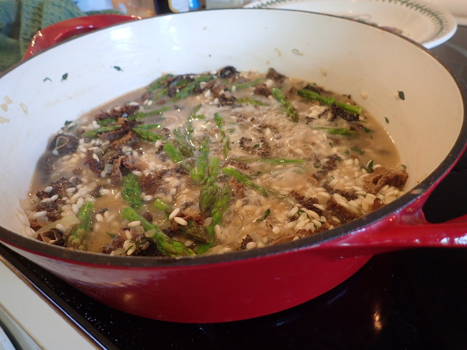 Risotto is a northern Italian rice dish cooked in a broth to a nice, creamy consistency. It has a reputation for being difficult and time consuming, which is kinda true. It takes about 20-30 minutes of hands-on cooking to make a lovely risotto. We decided to try the baked version to see how it stood up to the traditional method, both in taste and consistency. This dish has a decidedly Alaskan flair, using locally harvested morel mushrooms, fresh Alaska asparagus and thyme. The final result was sooo good - creamy, flavorful, a beautiful presentation...and half the hands-on time! -Audrey & Patti